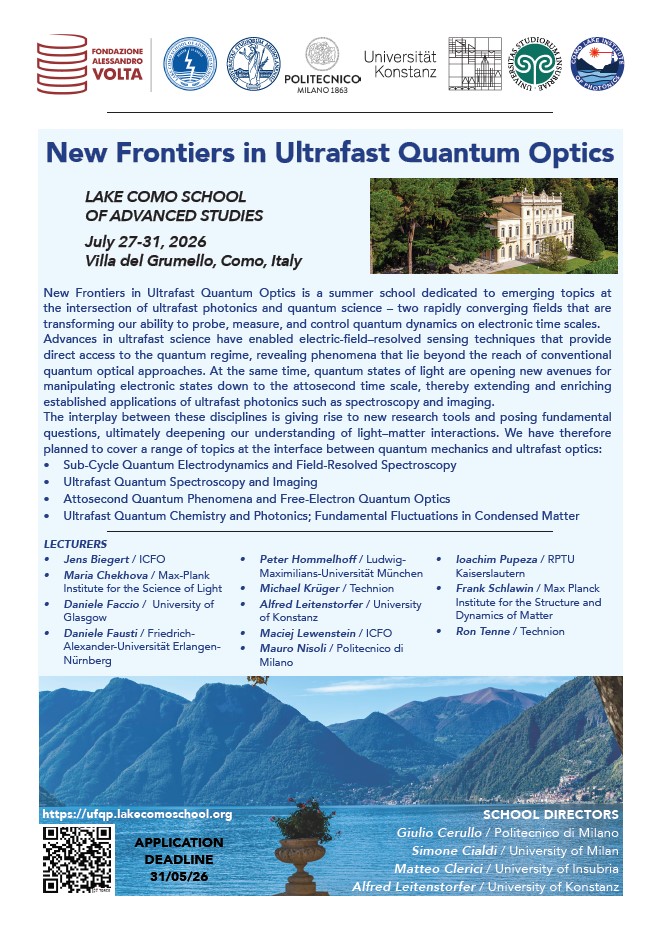 New Frontiers in Ultrafast Quantum Optics is a summer school dedicated to the emerging topics arising from the rapidly converging fields of ultrafast photonics and quantum science, which together are revolutionizing our ability to probe, measure, and control quantum dynamics at electronic time scales. On the one hand, electric-field-resolved sensing, empowered by developments in ultrafast science, has pierced a hole into the quantum realm, revealing novel effects that eluded standard quantum optical approaches. On the other hand, quantum states of light are providing novel tools for the manipulation of electronic states down to the attosecond time scale, in turn advancing well-established applications of ultrafast photonics, such as spectroscopy and imaging. The interplay between these two disciplines is leading to new investigation tools and raising fundamental questions, advancing our understanding of light-matter interactions. We have therefore planned to cover a range of topics at the interface between quantum mechanics and ultrafast optics: